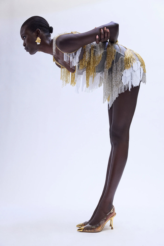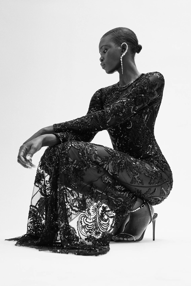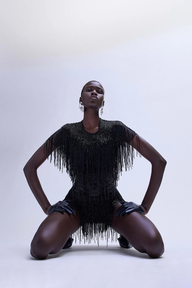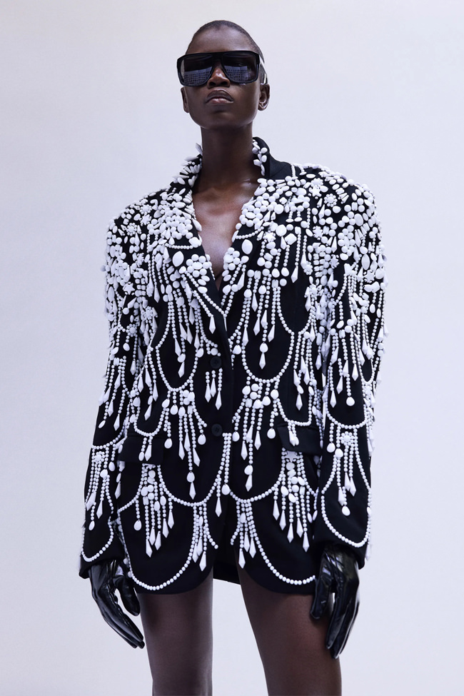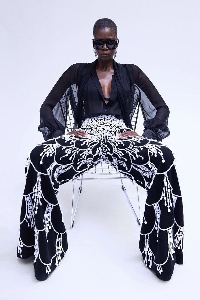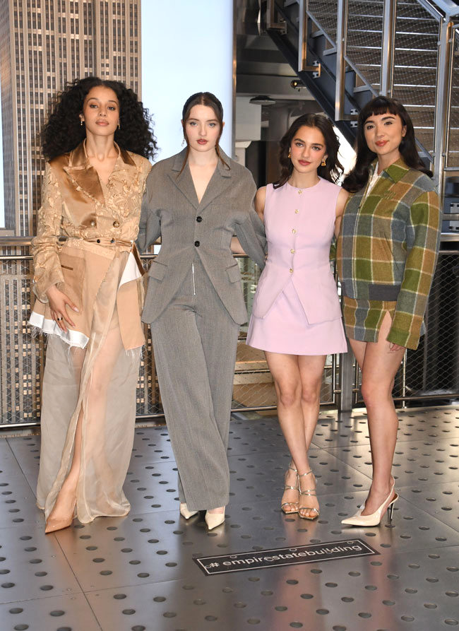 In stark contrast to the white robes she dons to play Daisy in The Handmaid’s Tale sequel series The Testaments, when Glamour meets Lucy Halliday at London’s Raffles Hotel she is dressed in all black, her top and trousers peppered with sparkles.